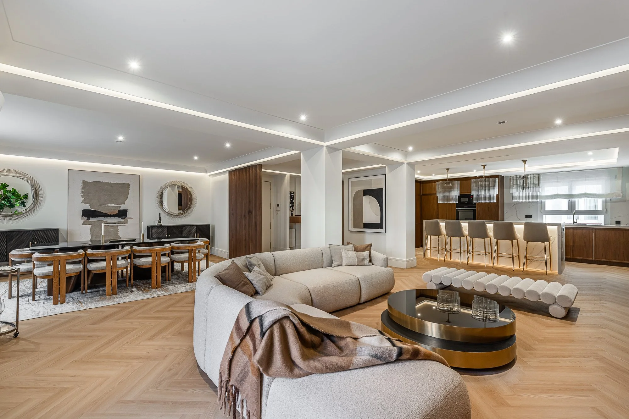 Los ambientes han sido diseñados para ofrecer funcionalidad y confort, con dormitorios en suite, amplios vestidores y una zona social que articula cocina, comedor y salón como un gran espacio continuo.